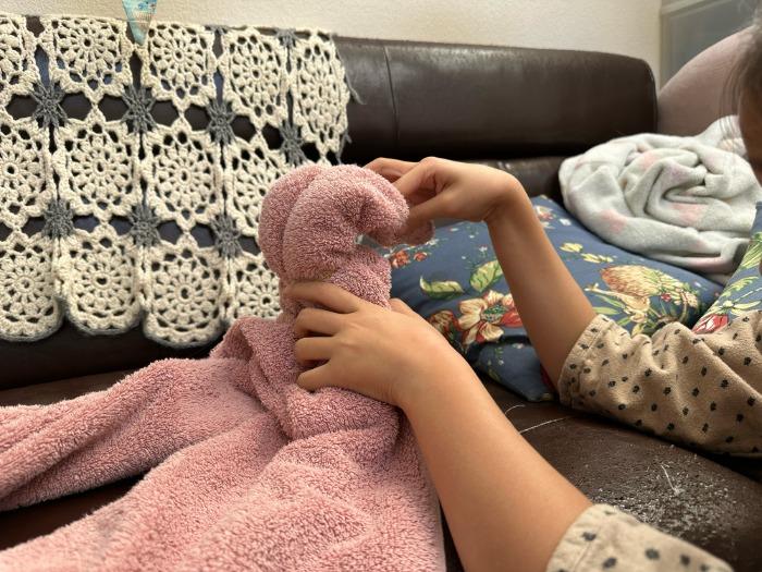 タオルで鶴を作るときにお手本を見せてくれてわかりやすかった。作るのも楽しかった。