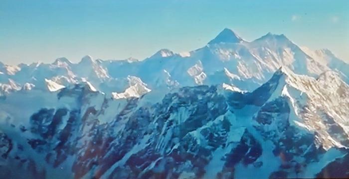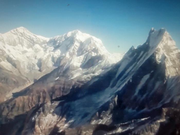 オンラインツアでのマチャプチャレの写真、遠くにサガルマータの突き出した山並みの写真。