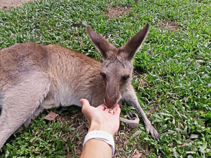 ガイドさんが餌をロックワラビーにあげながら、ワラビーをアップで撮してくださいます。