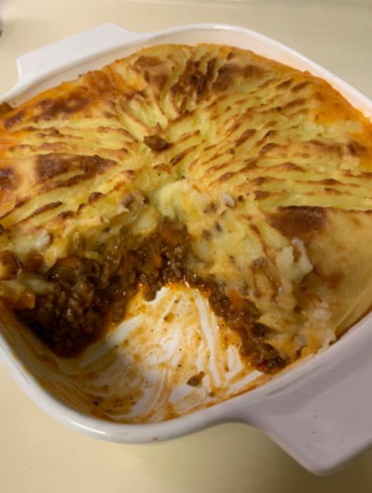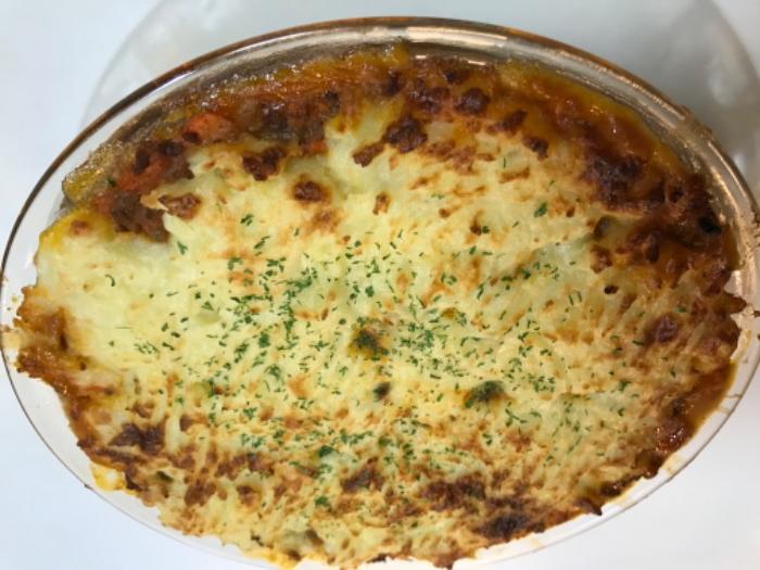佐久間さんと一緒に作っているとソースをどこまで煮詰めていいかわかりやすかったです。マッシュポテトの作り方、水に晒さないやり方とチーズを一緒に混ざること目から鱗の情報でした。苦労したのはマッシュポテトで全体を覆うところで、中身が見えてしまいました。味は本当に美味しくて、ウスターソースが決め手というのも納得でした。次回はマッシュルームやセロリを使ってみたいです。