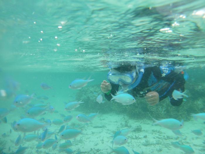 グアムのビーチは時間帯によっては浅くなり、小さな子供や泳ぎが得意でない方でも多くの魚を観れるので最高です!!