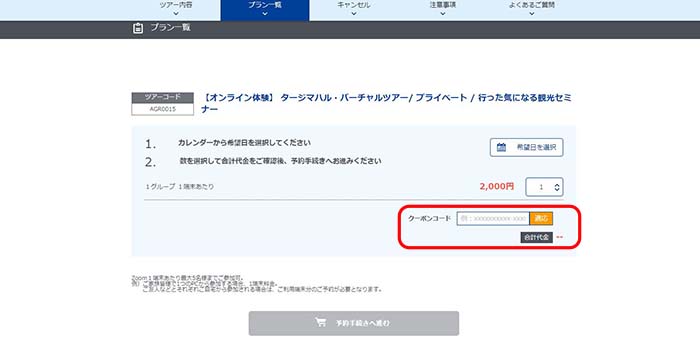 日付とグループ数を入れる下に上記キャンペーンコードをコピーして入力すると割引料金が適応した金額となります!