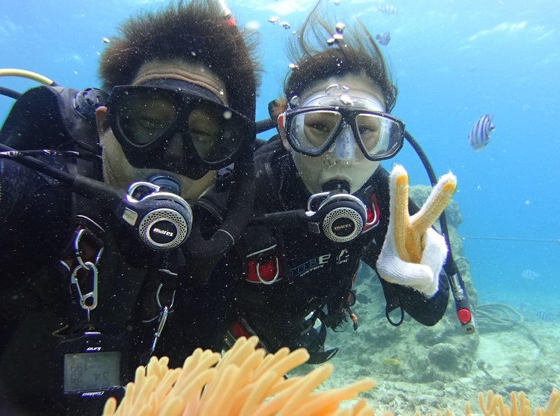 ダイビングライセンスなしでも参加できる「体験ダイビング」は、インストラクター引率の元、3〜5メートルまでの海を潜ることができるアクティビティーです - 泳げなくても大丈夫