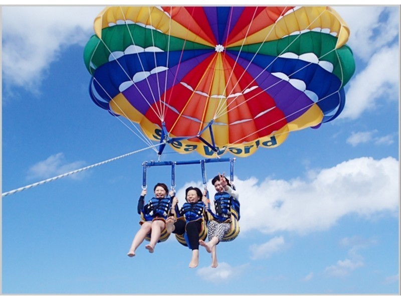 ※パラセーリングは当日の波、風の状況と体重の関係によって安全管理のため1~4名乗りをスタッフが判断します。可能な限り同グループゲスト様同士でのフライトを調整しますが、場合によってはスタッフや他のゲスト様との同乗をお願いする場合がありますことをご了承ください。