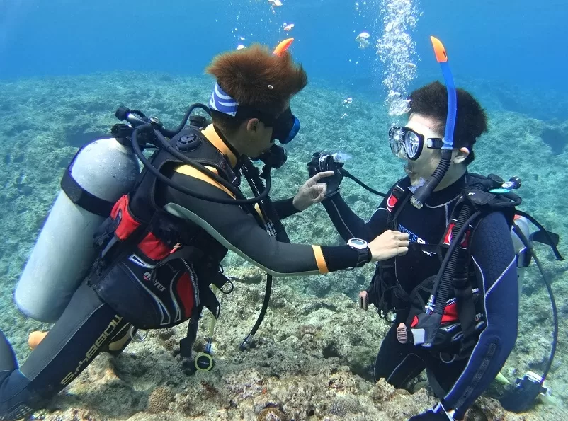 午前中に学科講習と前日の問題の回答しながらダイビングの基礎知識を高めます。午後からはビーチでの限定水域講習と海洋実習№1を実施します。