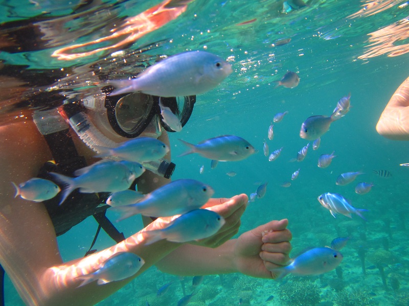 シュノーケリングポイントにて熱帯魚餌付け・サンゴ観察