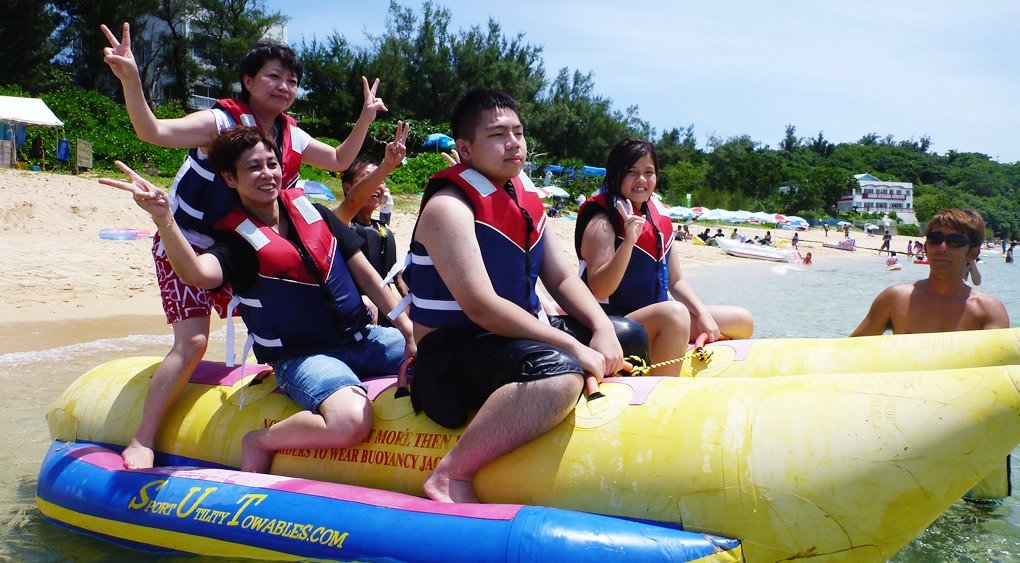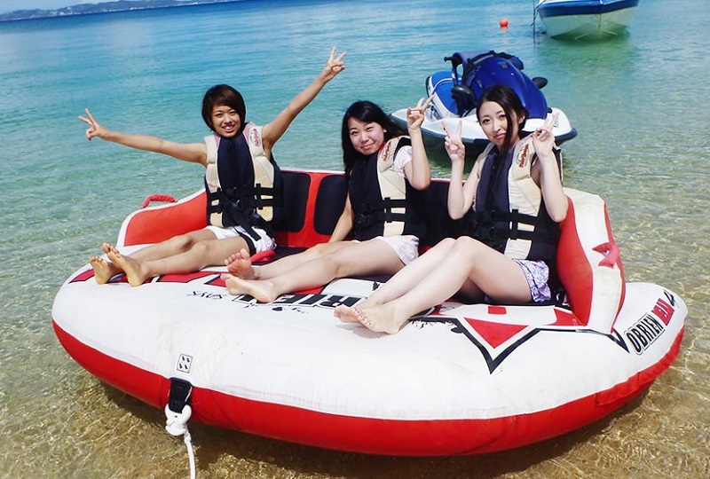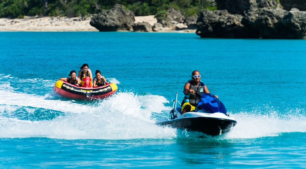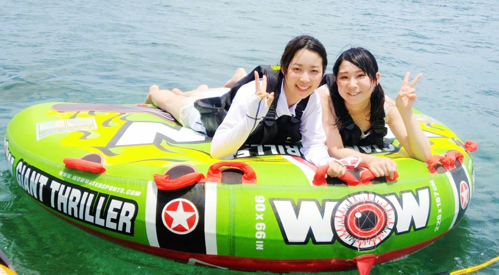 海洋状況により海中道路集辺のビーチを使いワケ。より穏やかなビーチで開催いたします。 - マリンチューブは定番のバナナボートから、マーブル、スリラーなどゆったり系、絶叫系と異なる遊具をご用意しています。