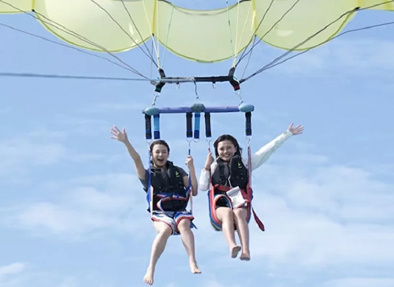 - パラセーリングをするポイントや参加人数にもよりますが、港を出て、港へ戻るまで30分~60分ほどです。一組様パラセーリングのお時間は上がり始めよりボートへ戻るまで約10分程となります。
