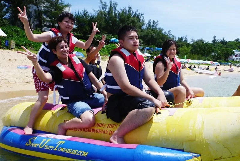 海洋状況により海中道路集辺のビーチを使いワケ。より穏やかなビーチで開催いたします。 - マリンチューブは定番のバナナボートから、マーブル、スリラーなどゆったり系、絶叫系と異なる遊具をご用意しています。