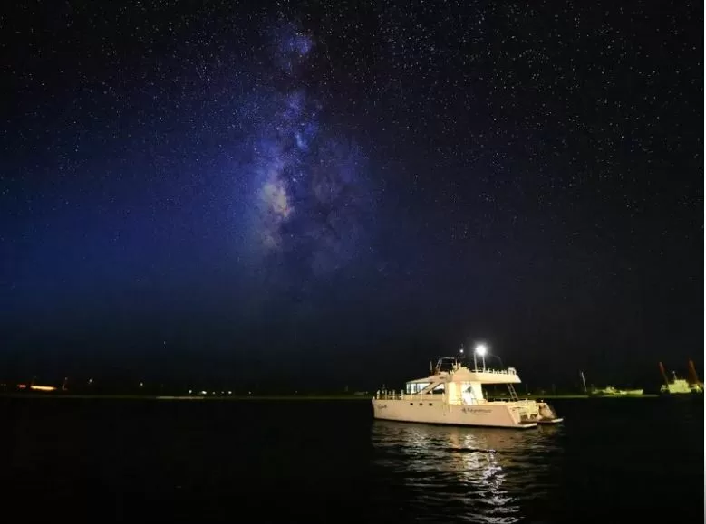 満月の夜には「天の川」こそ見られませんが、月明かりに照らされながら海面に映る「ムーンリバー」(月の光の道)の上をクルージングするのも最高です。 - 明かりの無い海上だから星空がより美しく見える