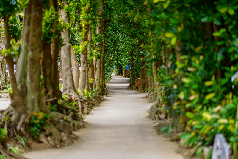 沖縄の古き良き原風景が残るフクギ並木を。緑に癒されながら、のんびり散策