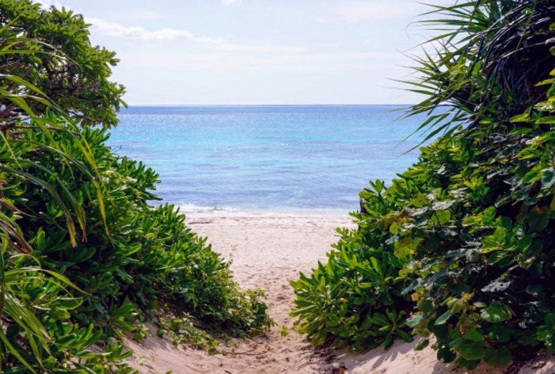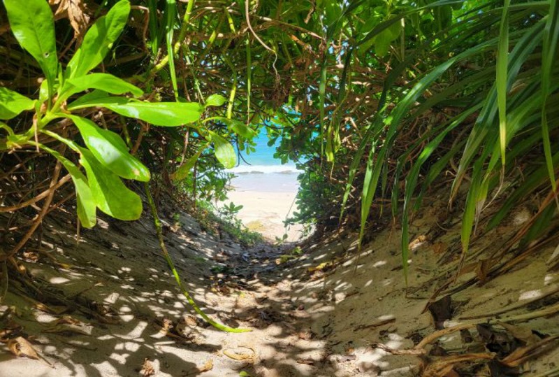 長間浜に行く際、アダンの木が作るアーチの下をくぐり抜け白い砂の坂道を通ります。