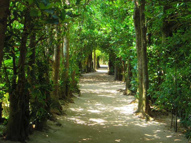 約1kmに渡って、防風林として植えられたフクギが数千本も存在する並木道。 集落やカフェなどが点在していますのでここでランチをお勧めします