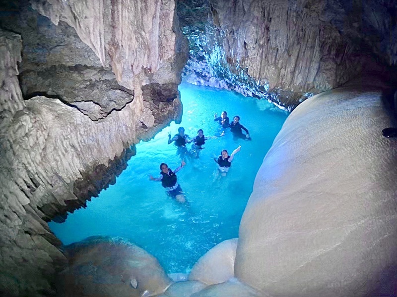 カボチャ型の鍾乳石が珍しい「パンプキンホール」をケイビング。地元宮古島では「竜宮城」と呼ばれています。全身を使って鍾乳洞を登ったり下りたり。最後は飛び込みスポットもあり楽しさ抜群!