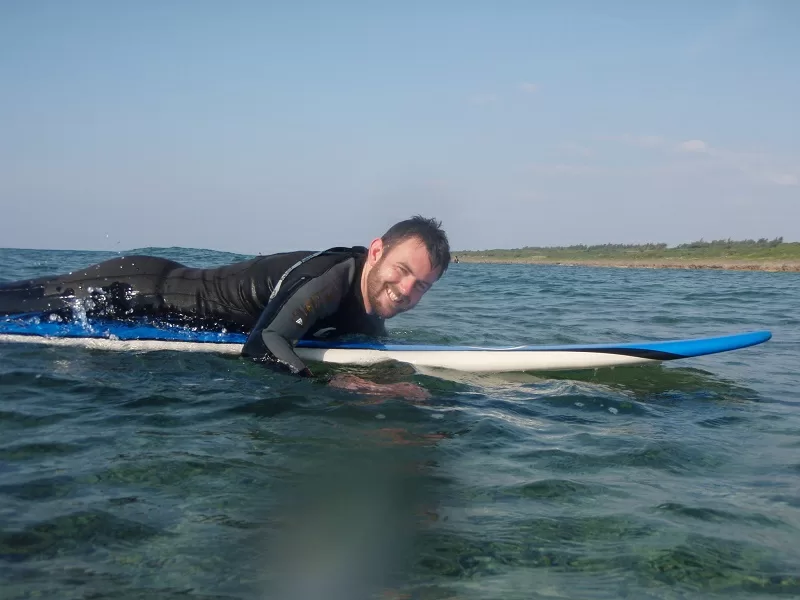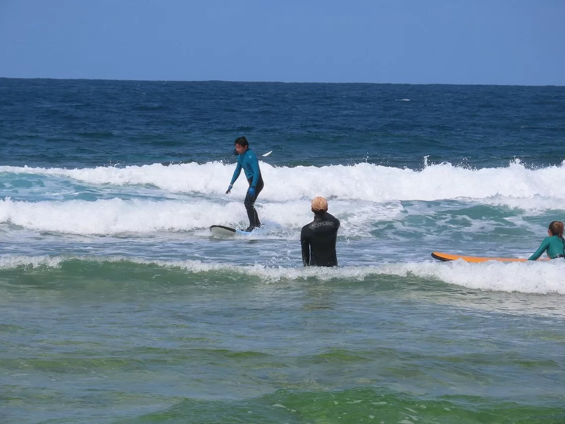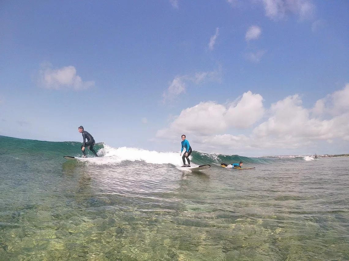 - 経験者はアウトサイド(沖で通常のサーフィン)で未経験者は浅瀬のホワイトウォーター(スープ)の波でコースを開催するので同じサーフポイントになります。