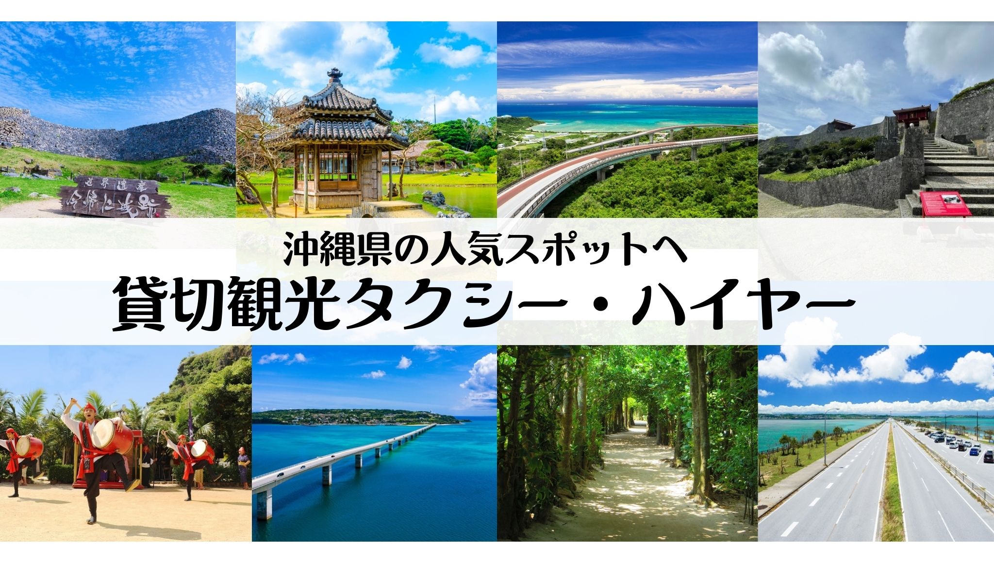 車両ごとの貸切りをして、ご家族・ご友人同士で気兼ねなくプライベートな時間をお過ごしいただけ、効率的かつ快適に観光地を巡る観光タクシー、ハイヤーでのプランをご用意しました。 世界遺産巡りや絶景映えスポット巡りなど沖縄県の魅力を満喫できるコースです。