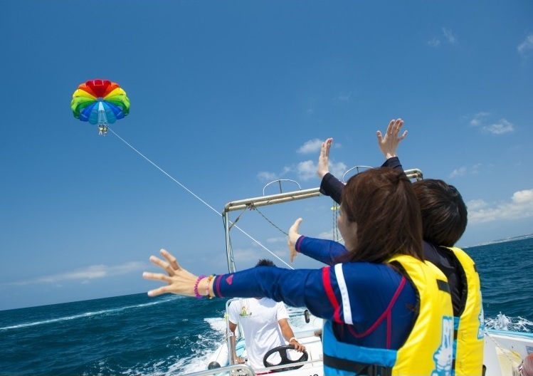 人気の景勝地「青の洞窟」があり、パラセーリング中にはこの神秘的な青い海域や、ダイビング・シュノーケリングを楽しむ人々を眺められたり、周辺には大型リゾートホテルが立ち並び、美しいビーチやホテルのプールなど、沖縄らしいリゾート感満載の景色が広がります。