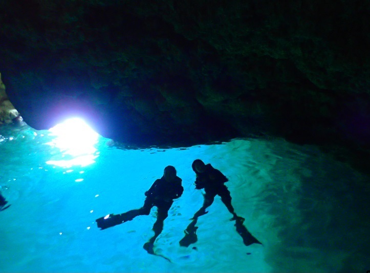 海水の浸食によって出来た洞窟内部の海面が太陽の光の反射で青く輝く美しい場所。