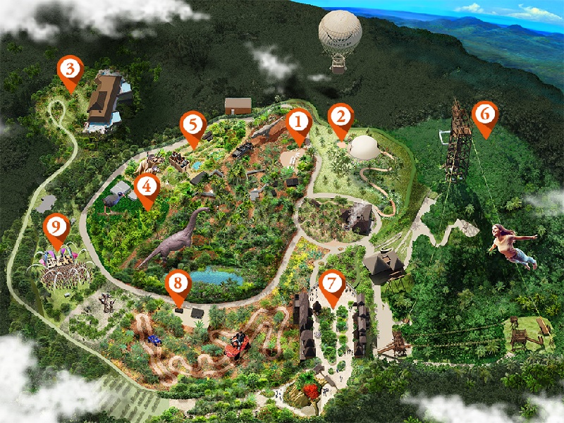 巨大気球から見渡すのは、360°すべてがここでしか手に入らない雄大な絶景。生命力あふれる濃緑の森。高度を増すごとに、少しずつ現れるエメラルドグリーンの海が陽光を浴びて輝く。スパークリングワインのグラスを優雅に傾けながら、ゆったりとゴンドラで寛げば、晴れ渡る真っ青な空も、夕暮れのピンクからオレンジへの美しいグラデーションも、見るたびに感動できる贅沢体験です。MAP2