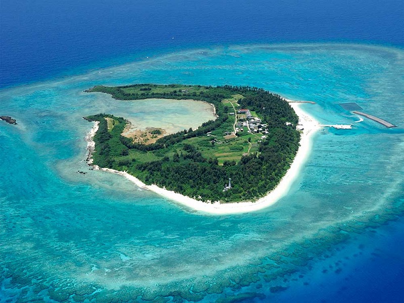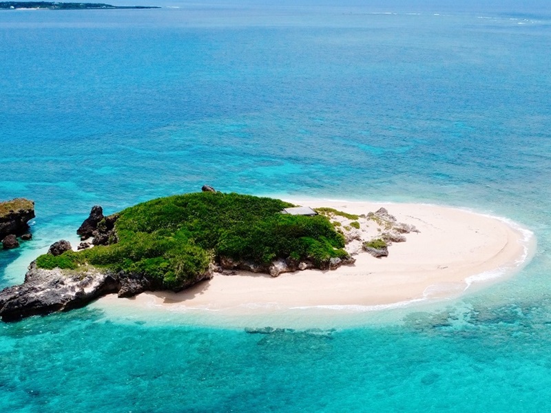 本部半島から望む離島水納島珊瑚礁に浮かぶ島を上空から見るとクロワッサンに見えることから「クロワッサンアイランド」と呼ばれ親しまれています。