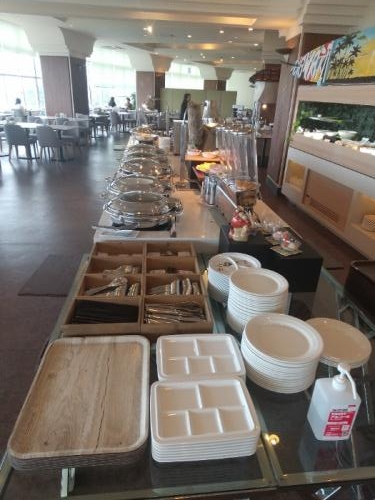 朝にファミリー向けの朝食バイキングを食べて、青空とゴルフ場の緑を見ながら、元気いっぱい一日を頂きました。