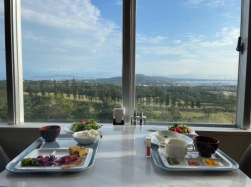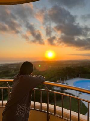 沖縄でも高い山にこのホテルが建っていると教えてもらい、部屋に行きベランダに出てみると景色が想像を絶する素晴らしさには感動でした。ベランダからは左には西海岸右には東海岸真ん中は山があり、最高にみる価値ありです。お風呂も丁度良い湯加減で、大きさも気に入っています。朝食も美味しかったし、また予約しました〜