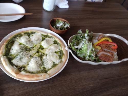 牛カツカレーとピザがランチで選べます。カツカレーのボリュームがけっこうあるので2人で行かれる方は是非、カレーとピザを一つづつオーダーしてシェアして食べることをおすすめします!