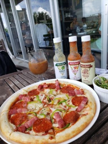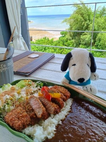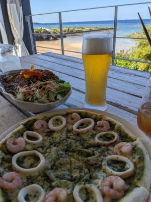 牛カツカレーとピザを海の見えるテラスで頂いて