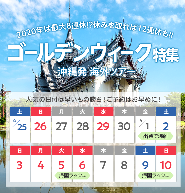 総合旅行サイトHIS 特集一覧 ゴールデンウィーク特集 そのほか発着地から探す 北海道発 東北発 甲信越発 中部発 北陸発 関西発 中国発 四国発 九州発 沖縄発 閉じる ゴールデンウィークのご旅行もHISにお任せ!人気のエリアを格安でご用意しております。 方面から選ぶ タイ 台湾 韓国 ご希望の日程でツアーを検索 タイ バンコクツアー 【那覇空港発】 <3~9月出発>絶景寺院&リバークルーズへご案内!得BUYバンコク4日間 バンコクパレスに滞在 (2020/03~2020/09出発) 74,800円~119,000円 [燃油サーチャージ込み] 【那覇空港発】 <3~9月出発>世界遺産アユタヤ遺跡観光やカニカレーなど8回の食事付 新いいとこどり!バンコク&アユタヤ5日間 ウィンザー スイートに滞在 (2020/03~2020/09出発) 106,000円~154,000円 [燃油サーチャージ込み] そのほかバンコクツアーを検索 バンコク方面航空券を検索 バンコク方面航空券+ホテルを検索 台湾 台北ツアー 【那覇空港発】 <3~6月出発>MRT1日乗車券とオープントップバス4時間乗車券付 タイガーエア台湾で行く フリープラン台北3日間 グリーンワールド林森に滞在 (2020/03~2020/06出発) 32,800円~74,800円 [燃油サーチャージなし] 【那覇空港発】 <3~6月出発>MRT1日乗車券とオープントップバス4時間乗車券付 チャイナエアラインで行く フリープラン台北3日間 グリーンワールドグランド 南京に滞在 (2020/03~2020/06出発) 49,800円~86,800円 [燃油サーチャージ込み] そのほか台北ツアーを検索 台北方面航空券を検索 台北方面航空券+ホテルを検索 韓国 ソウルツアー 【那覇空港発】 <4~9月出発>明洞周辺エリアに泊まる ソウル3日間 レックスに滞在 (2020/04~2020/09出発) 24,800円~52,800円 [燃油サーチャージ込み] 【那覇空港発】 <4~9月出発>明洞周辺エリアに泊まる ソウル4日間 ホテルグレイスリーソウルに滞在 (2020/04~2020/09出発) 35,800円~66,800円 [燃油サーチャージ込み] そのほかソウルツアーを検索 ソウル方面航空券を検索 ソウル方面航空券+ホテルを検索