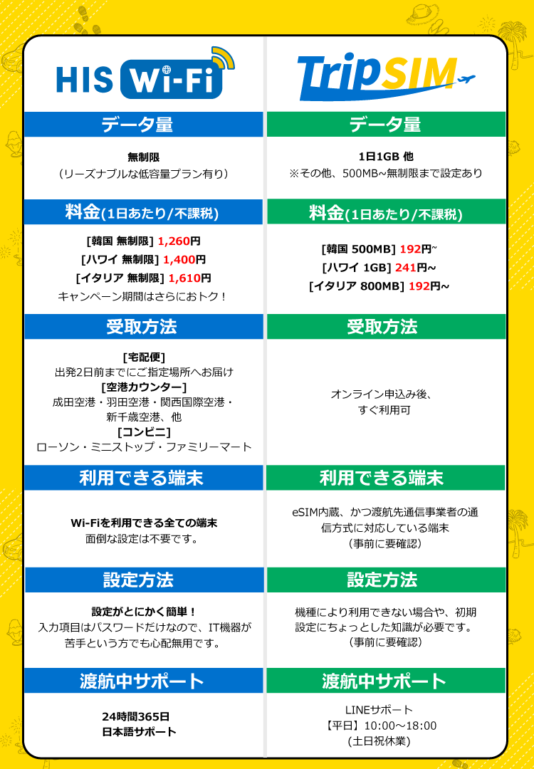 | 利用できる端末 | Wi-Fiを利用できる全ての端末面倒な設定は不要です。 | eSIM内蔵、かつ渡航先通信事業者の通信方式に対応している端末 (事前に要確認) |