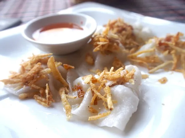 米粉の皮でエビなどの餡をくるんで蒸した、餃子のようなホイアン名物料理。皮は真っ白で、その見た目からホワイトローズと名付けられました。細かく切った揚げワンタンがトッピングされています。