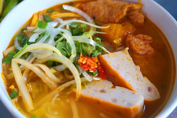 サバの頭やマグロ、トマトなど魚介と野菜からとった出汁で作るスープに米麺を入れた、ベトナム中部の名物料理。マグロやその他魚介の練り物やつみれがトッピングされます。