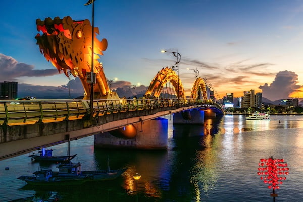 龍が橋から飛び出しているようなインパクトのある見た目。ダナンに行ったら一度は目にすることがあるでしょう。週末の夜8時半から、10分間の炎と水のショーが開催されます。