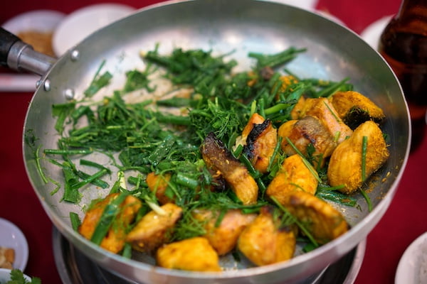 ハノイの郷土料理チャーカー。白身魚をカレー粉で炒めて、ブン(米麺)とともにいただきます。テーブルのコンロで炒められるのでアツアツのうちに食べることができます。