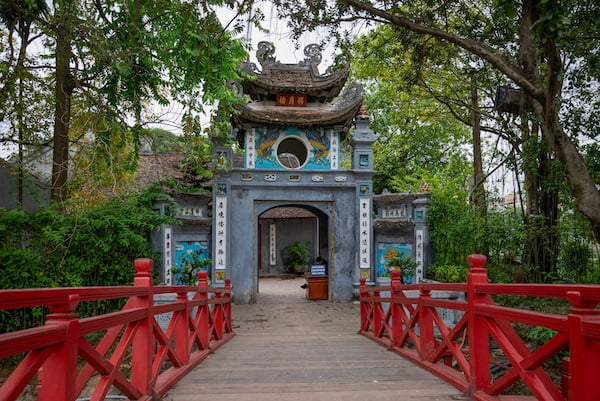 ホアンキエム湖に浮かぶ島に建つ祠堂。15世紀に明軍に神剣で勝利した際、竜王に神剣を返すために大亀が現れたという伝説がある場所です。そのため境内には亀が描かれた碑や、1968年にホアンキエム湖で発見された大亀のはく製も置かれています。