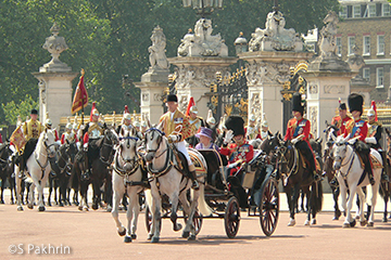 1748年からの歴史を持つ騎馬隊のパレード、トゥルーピング・ザ・カラー (Trooping the Colour)。約1400人の衛兵、400頭の馬、400人の音楽隊による華やかなパレードは、お誕生式典最大のイベントです。国王の実際のお誕生日は11月14日ですが、英国で最も気候が穏やかだと言われている6月に公式誕生日を設定して、王室ご一家も国民も皆、快適に外でのお祝い行事を行えるようにということで毎年設定されております。