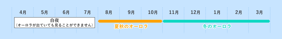 北欧やカナダで、実際にオーロラが観測できる時期は、白夜が終わる8月~4月頃まで。