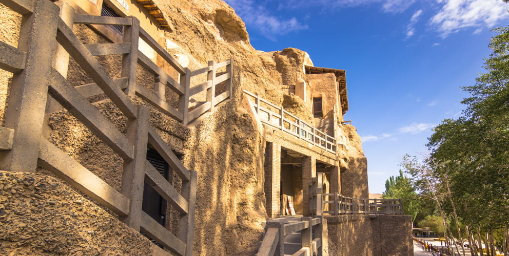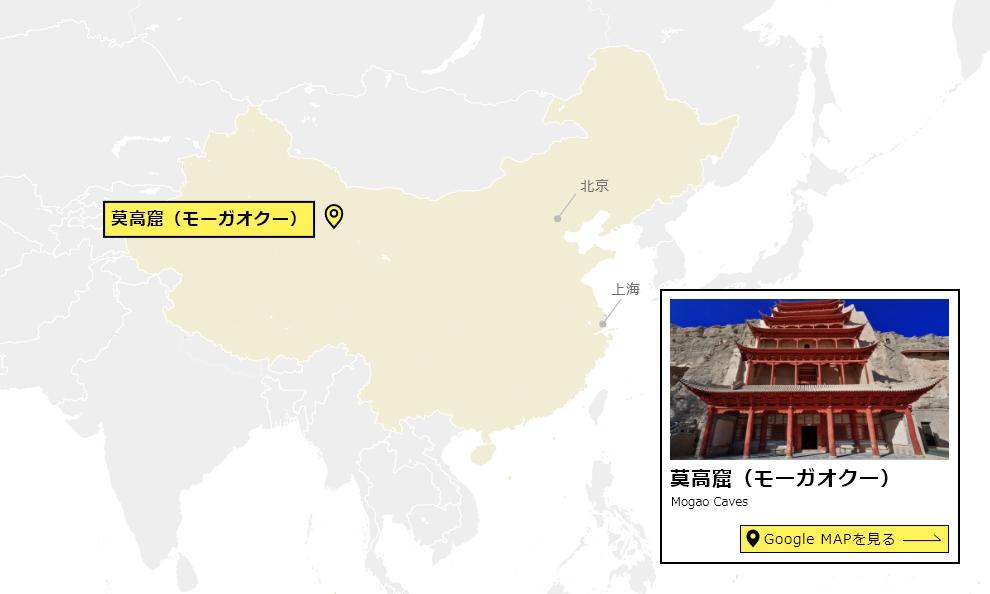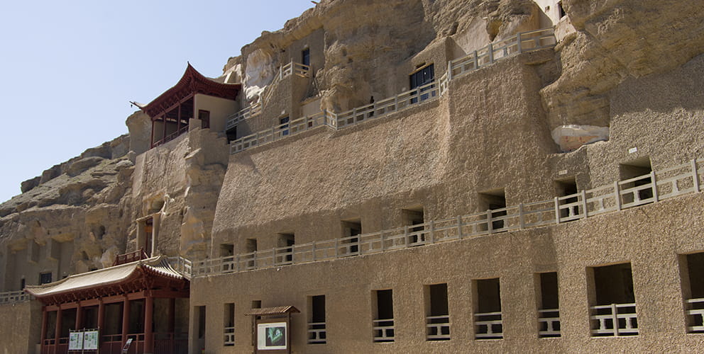 4世紀~14世紀に鳴沙山の東の麓に築かれた石窟群、莫高窟(モーガオクー)。綿密な壁画や塑像が残されている。 シルクロードの西端、敦煌にある莫高窟は、長さ1,600m、高さ50mにわたり上下5層に築かれた石窟群。全部で492の窟があり、その中に2,400余りの仏塑像が安置され、壁にも仏像にも鮮明な彩色が施されている。崖沿いに蜂の巣のように窟が並ぶ様子は圧巻。4世紀の中頃から、およそ1,000年間にわたって石窟が掘り続けられた。 1900年に数万巻におよぶ古文書が見つかり世界中で話題になった第17窟、日本の法隆寺金堂壁画と通じる壁画が発見された第220窟など、それぞれ作られた時代を反映した学術的にも価値の高い遺産の宝庫。
