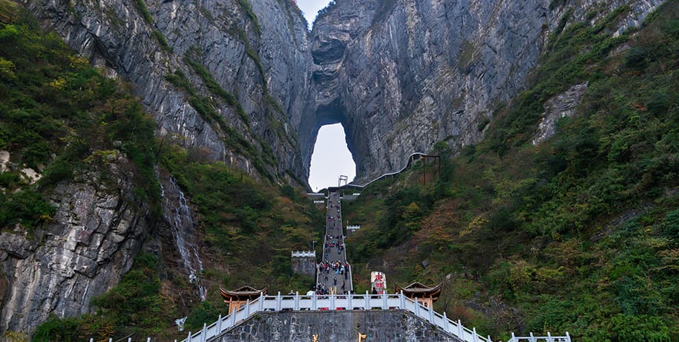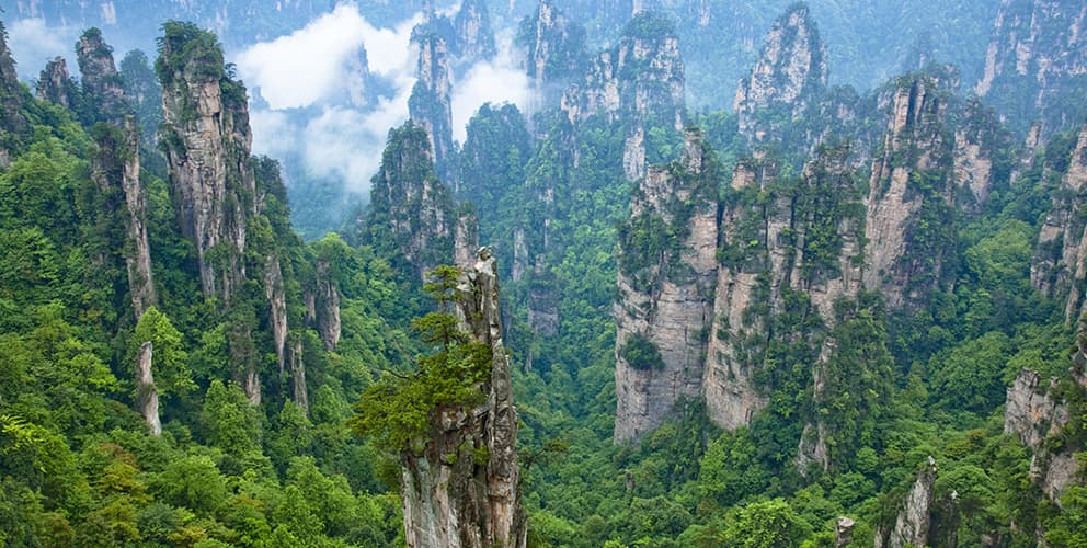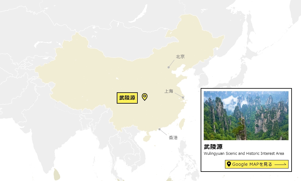 湖南省、張家界市に位置する武陵源。張家界国家森林公園、索渓峪自然保護区、天子山自然保護区の三つの風景区で構成されている。海底にあった地形が数億年の間に起こった地殻変動による隆起や、雨風による浸食によって現在の姿になったと考えられており、「珪岩」でできた高さ200mを超える石柱が3000 本以上も立つ。また、地殻形成の過程でできた規模の大きな鍾乳洞が40近く発見されていることや、この地区に生息する絶滅危惧種も含む動植物も注目されている。
