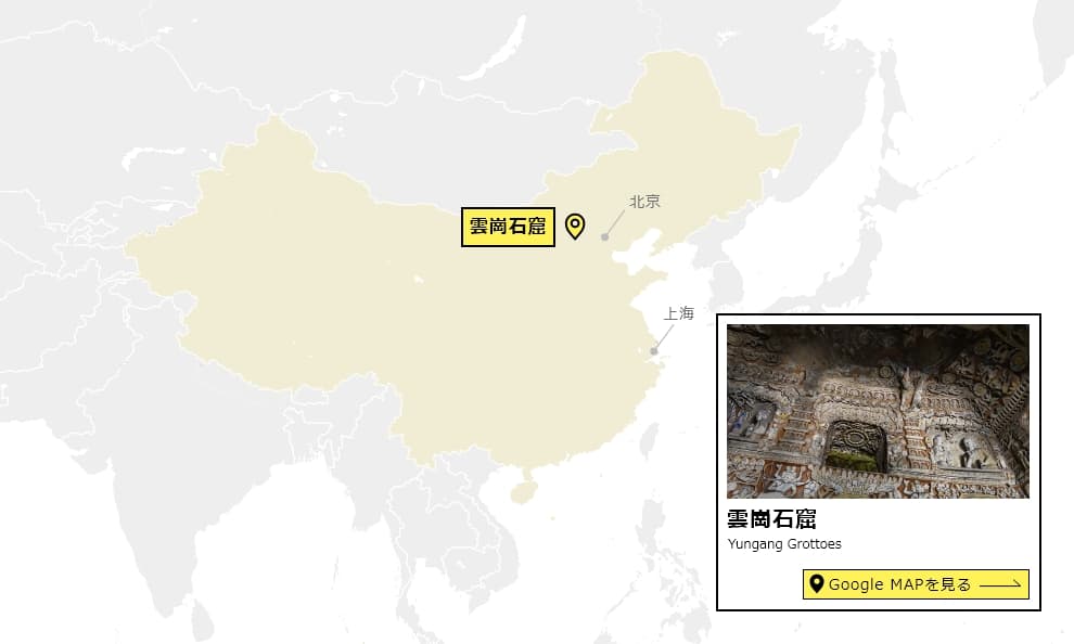 雲岡石窟は中国山西省大同市の西約16 km、梧州(周)山の南麓と梧州川の北岸に位置している世界遺産。敦煌の莫高窟、洛陽の龍門石窟と並び「中国三大石窟」といわれている。洞窟エリアは、東から西にかけての自然の山々に基づいて、東、中、西の3つのエリアに分かれており、460年(北魏の時代)に開削が始まったとされる歴史ある洞窟遺跡を見学することができる。それほど古い時代の遺跡にも関わらず、主要な石仏はきれいな状態で残されており、驚きと感動を集める人気の世界遺産である。