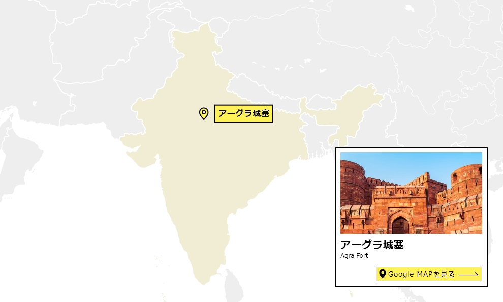 インドのアーグラにあるアーグラ城塞はムガル帝国時代に建てられた城塞。デリーからアーグラへ遷都した際に完成し、3代目皇帝アクバルから5代目皇帝ジャハーンまでが居城とした。その外観から「赤い城」と呼ばれているが(デリーのレッドフォートとは別)、実際宮殿内部の床には白い大理石もふんだんに使われている。アーグラ城に最後に暮らした5代目皇帝ジャハーンが、早逝した妻のために建てたのがあの「タージ・マハル」なのです。ジャハーンは、家族をも殺す残忍な性格から、息子によってアーグラ城に幽閉されてしまい、「囚われの塔」からひっそりとタージ・マハルを眺めて過ごしたといわれています。