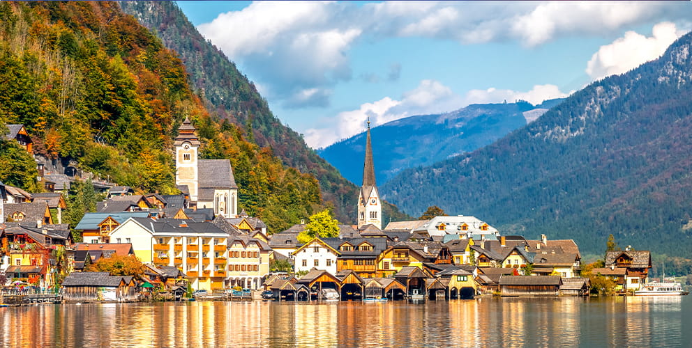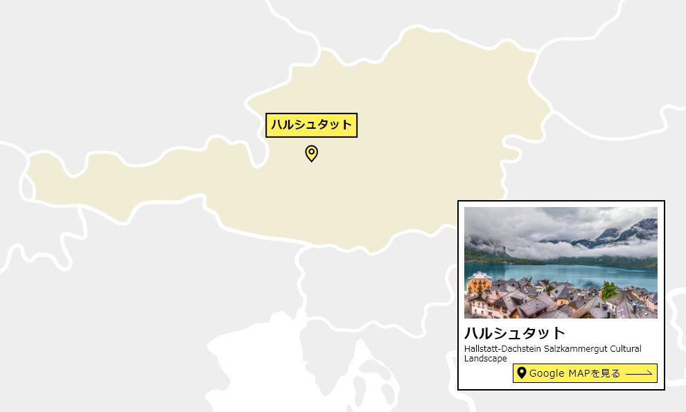 ザルツカンマーグートはザルツブルク市の東にある地域。アルプスの渓谷に抱かれるように、大小76もの湖が点在しながら、扇状に広がっており、映画「サウンド・オブ・ミュージック」の舞台としても名高い。この中にあるハルシュタットは、湖沿いにある人口1,000人ほどの街。 ハルシュタットはケルト語で「塩の町」を意味し、この地は、ハルシュタット文化と呼ばれる高度な文明が、紀元前10世紀頃から存在していた。それを支えたのはこの近くで採れる岩塩。当時、食料の唯一の保存方法であった塩は、白いダイヤと呼ばれ珍重された。木造建築物が多いのもこの街の特徴で、保存状態の良さはすべて塩の恩恵といわれている。