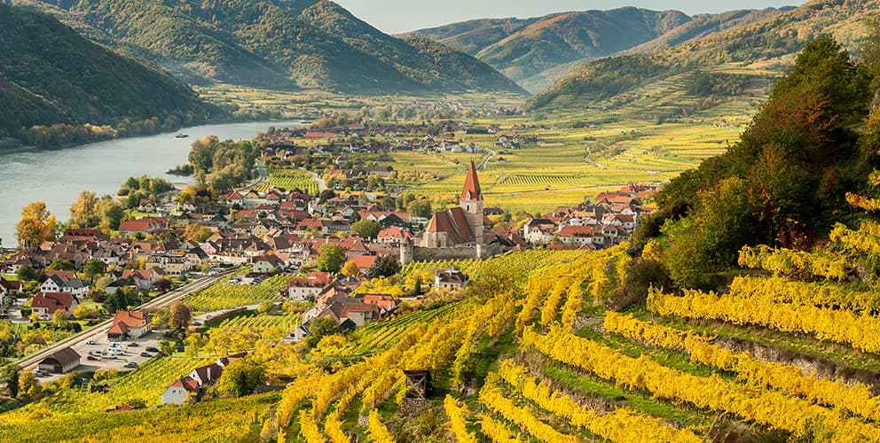 オーストリア北部、ドナウ川の中流に広がる36kmに及ぶ渓谷が「ヴァゥハウ渓谷」だ。渓谷の脇には修道院や城が点在し、クルーズしながら眺めるその情景は見事なもの。中世の時代にはこの界隈では争いが絶えず、丘や崖の上などの高いところに城が建てられらため、その景観が残っているそうだ。また、杏とブドウの栽培が盛んで、ワインの醸造も行われている。