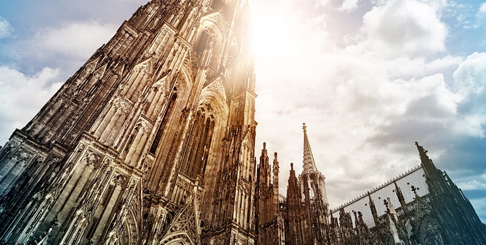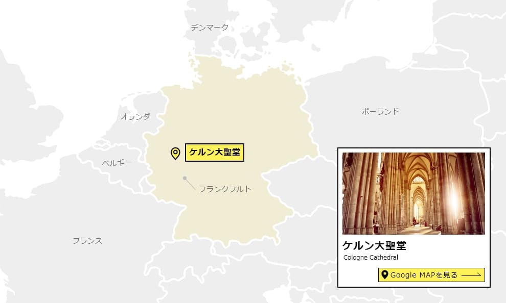 ケルン大聖堂は、正式名称はザンクト・ペーター・ウント・マリア大聖堂と言い、聖ペトロとマリア大聖堂という意味を持っている。ゴシック様式の建築物では、ドイツ3大聖堂の1つとなっており、157mにも及ぶ、2つの高い塔が特徴的で、世界最大級と言われている。