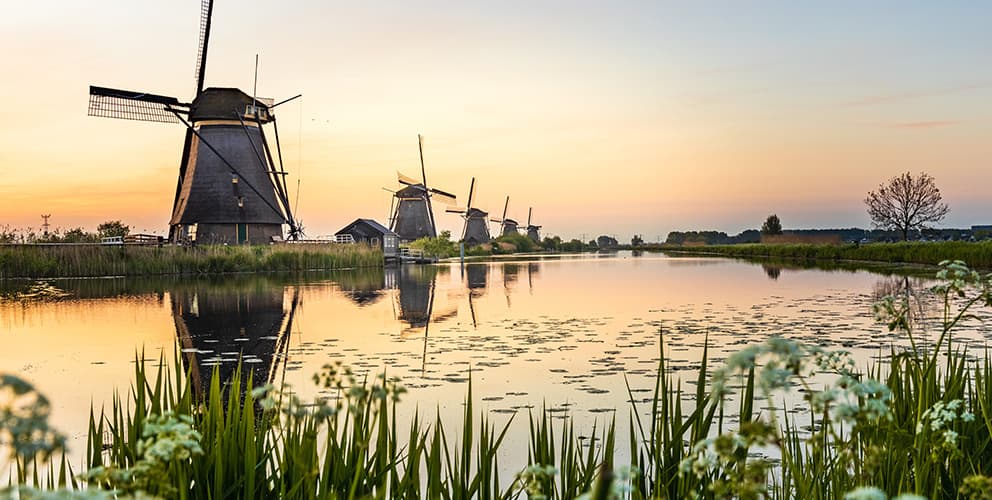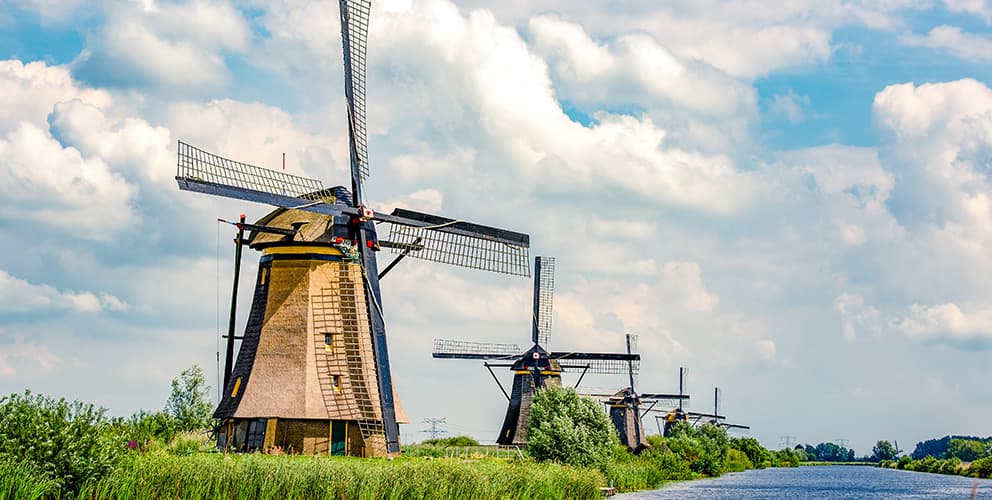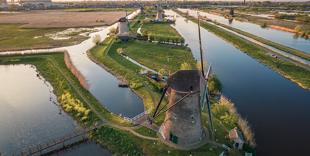 キンデルダイクはロッテルダムの南東15kmの川沿いに広がる風車群。かつて活躍した1,000基もの風車のうち、残った19基がここに集まっている。広々とした湿原に並ぶたくさんの風車は圧巻の迫力で、これぞオランダという景色だ。1740年ごろに風車が造られ始めた風車は、河川や地下水から水を引き上げる灌漑設備用として使われてきた。川に流された排水を再利用することでオランダの人々の生活をさせてきたのだ。
