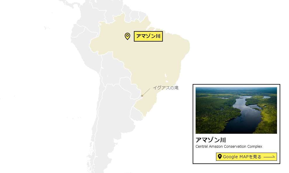 約120種のほ乳類が繁殖するアマゾン最大の保護区中央アマゾン保全地域群は、ブラジル北西部のジャウー川全流域を含む、アマゾン盆地最大の保護区。雨季によるアマゾン川の氾濫で、熱帯雨林は独自の生態系を形成している。 沼や湖はモザイク状に広がり、そこには世界最大のデンキウナギが生息している。ほかにも、巨大淡水魚アラパイマをはじめ、カワイルカやアマゾンマナティーなど、約120種のほ乳類が繁殖する適地となっている。