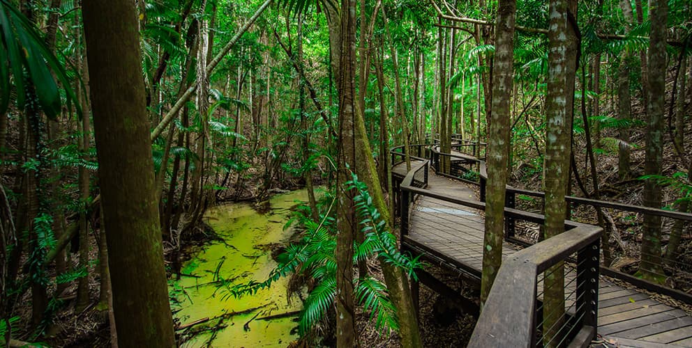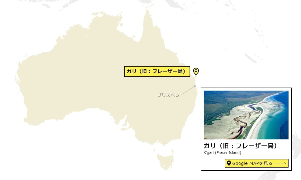 ブリスベンから北に300km。世界で最も大きい砂の島「ガリ(旧:フレーザー島)」がある。島の多くは「グレート・サンディ国立公園」として、世界遺産だけでなく、国立公園にも指定されている。砂の島は雨水が浸透しやすく通常は湖沼ができにくいが、ここガリには透明度抜群の淡水湖が40以上も。中でも最大のマッケンジー湖は、底にある純白のケイ砂ははっきりと見えるほど限りなく透明に近く、とにかく美しいのだ。陸には多様な野生生物も生息している。島には多種多様な自然と動植物が共存しており、訪れた際には人間がお邪魔させていただくという感覚を強く意識するかもしれない。