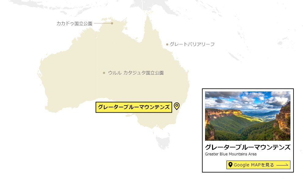 グレーターブルーマウンテンズ地域は、オーストラリア大陸の南東部に位置し、8つの国立公園からなっている。シドニーからも日帰りで楽しめる距離にあるため、人気の高い世界遺産となっている。地域一帯は、標高1,300m級の砂岩の峰々が連なる山岳地帯で、絶壁や渓谷、滝、沼地、湿原などが点在し、また断崖の上には3つの大きな岩が寄り添う、伝説の奇岩「スリーシスターズ(三姉妹岩)」があり、壮大な景観を楽しむことができる。 ここには、全世界の13%に相当する、90種以上のユーカリが繁茂している。これらのユーカリが大気中に放出するガスの色が水色であることから、ブルーマウンテンズの名がつけられた。さらに、1億年以上前の植物とされるウォレミマツや、132種の固有種など、豊かで貴重な植物が生息している。