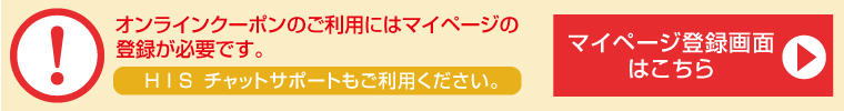 | ※ツアー基本代金、フライトアレンジ代金、延泊代金の合計がお1人さま7万円以上の商品が対象です。 ※HISのホームページ上でオンライン予約が可能な商品に限ります。 ※海外航空券、航空券+ホテル、オプショナルツアー、ホテル、国内ツアー、空港諸税等は割引の対象にはなりません。 |