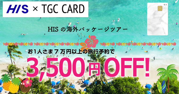 | ※1回のご予約で、1グループにつき、1クーポンのみご利用いただけます。 ※クーポンは、新規のご予約にのみ適用されます。変更の場合、新規での予約の取り直しが必要ですのでご注意ください。 ※こちらのクーポンは他の割引、オンラインクーポンとの併用はできません。 ※クーポンご利用後の金額は、マイページの「ご請求金額合計」よりご確認いただけます。 ※クーポンをキャンセルチャージに充当することはできません。 ※人数限定商品、空港税等、オプショナルツアー、保険は割引の対象外です。 ※TGC CARDでのお支払いが必要です。その他のクレジットカードでのお支払いはできません。 ※1人あたり50,000円以上70,000円未満の旅行代金のHIS海外ツアー商品を ネット予約なさる場合は、イオンマークのカードの優待特典3,000円OFFクーポンをご利用ください。 詳しくはこちら |